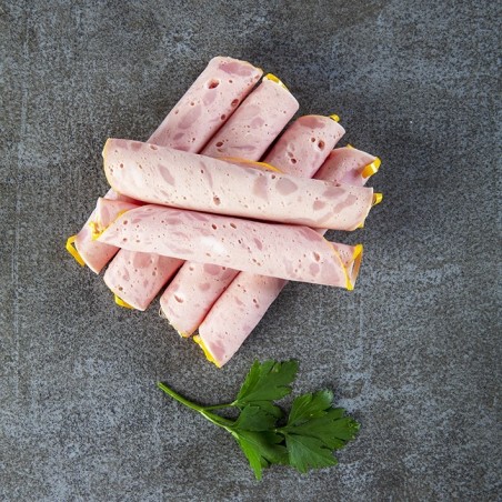 Mortadelle « jambon », farce fine de porc à base de jambon.